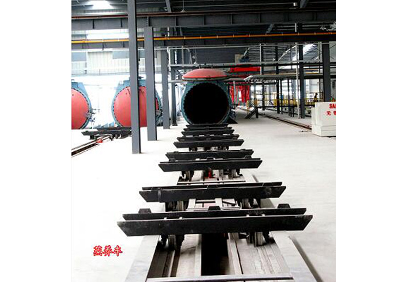小車在軌道上平穩(wěn)運行,車與車之間有掛鉤連接,進(jìn)入蒸壓釜,將坯體護(hù)養(yǎng),出釜時,將成品運送至堆放場地,脫鉤器摘去掛鉤。